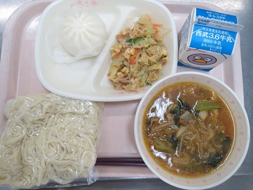 きょうの献立は キムチ入りごまみそラーメン・彩の国肉まん・中華サラダ・ 牛乳です。 エネルギー 842kcal たんぱく質 30.9g 脂 質 24.6g 食塩相当量 5.3g