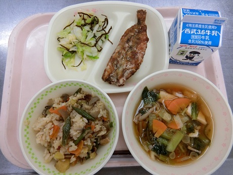 きょうの献立は 秋の香りごはん・いわしの竜田揚げ・塩こんキャベツ・きのこ汁・牛乳です。