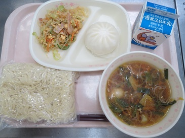 きょうの献立は 広東めん・彩の国肉まん・中華サラダ・牛乳です。