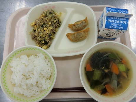 きょうの献立は ビビンバ・揚げぎょうざ・中華スープ・牛乳です。