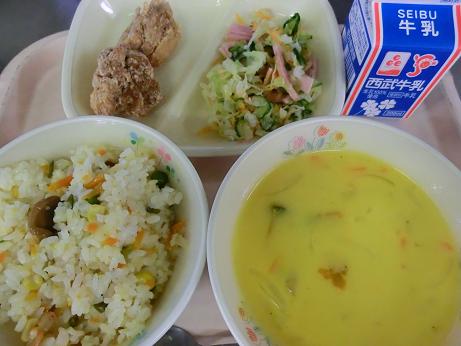 きょうは、えびピラフ・牛乳・からあげ・かぼちゃのポタージュ ハムときゃべつのサラダでした。 クリスマスメニューで冬至が近いのでかぼちゃのポタージュ を作りました。