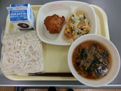 けんちんうどん・おからドーナツ・野菜炒め・牛乳