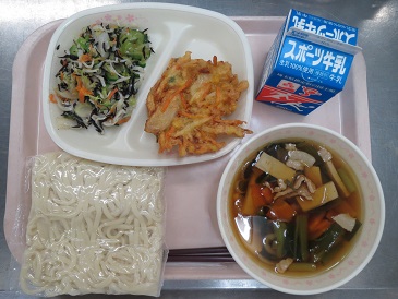 肉うどん・季節のかき揚げ・ひじきサラダ・スポーツ牛乳
