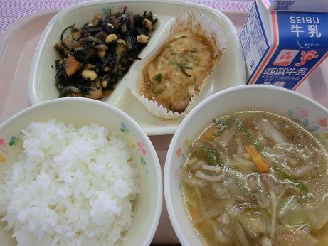 きょうは、 ごはん・牛乳・さばのねぎみそ焼き・大豆とひじきの煮物 ちゃんこスープでした。 ちゃんこスープはちゃんこ鍋をイメージした具だくさんのスープ です。鶏肉・にんじん・ごぼう・だいこんきゃべつ・ねぎ・ えのきたけが入って野菜がたっぷりとれます。