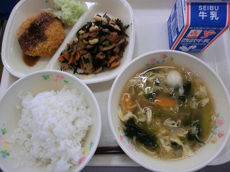 ごはん・牛乳・エビカツ・大豆の磯煮・月見汁