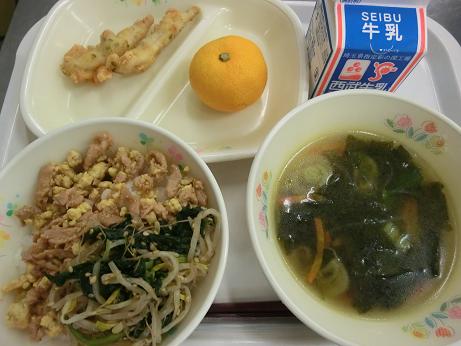 ビビンバ・牛乳・わかさぎフリッター・春雨スープ