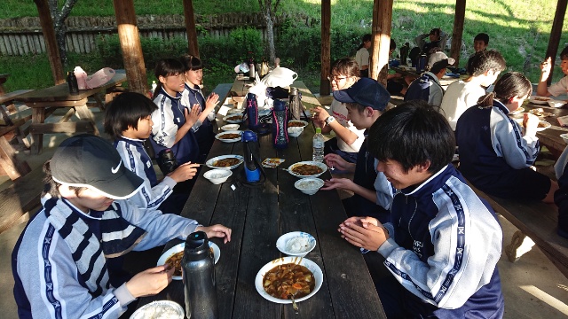 どの班も、ケガなく無事に作れました。 美味しく「いただきます」  |