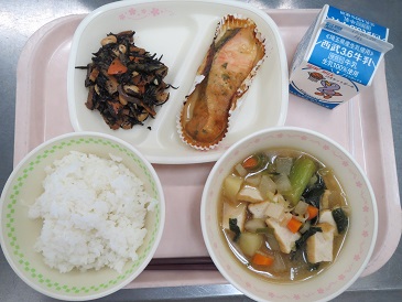 きょうの献立は ごはん・鮭のみそマヨ焼き・大豆の磯煮・野菜椀・牛乳です。 エネルギー 791 kcal たんぱく質 37.0g 脂 質 24.1g 食塩相当量 3.1g