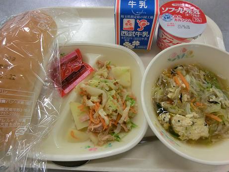 きょうは、 コッペパン・イチゴジャム・牛乳・豆腐団子のスープ ツナと野菜のミックスサラダ・ヨーグルトでした。 きょうは、予定していた「揚げパン」が揚げ物機の故障のため 実施できなくて残念でした。来週には修理ができそうなので もうしばらくお待ちください。 |