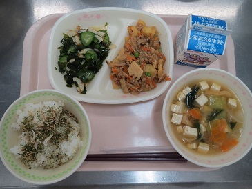 揚げじゃがのそぼろ煮・竹輪とわかめのポン酢和え・みそ汁・牛乳
