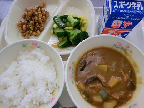 夏野菜カレー・牛乳・大豆とじゃこの甘辛揚げ