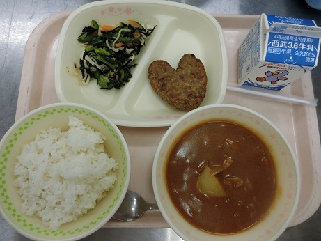 ハヤシライス・ハートのハンバーグ・ほうれん草のサラダ・牛乳