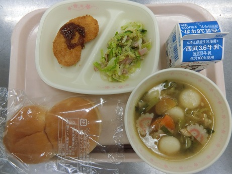コロッケサンド・たくあんサラダ・お雑煮・牛乳