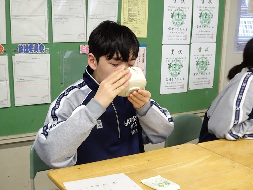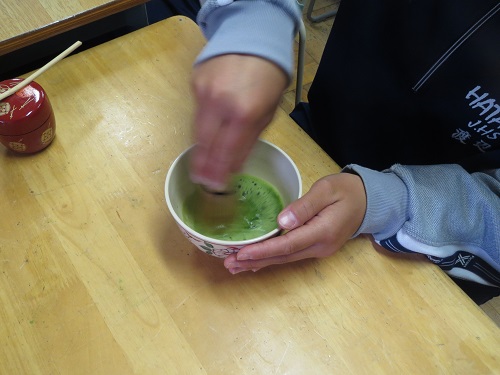 2年生が総合学習で、抹茶を点てる体験をしました。 修学旅行で訪れる京都でもおいしい抹茶を飲みたいですね。