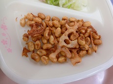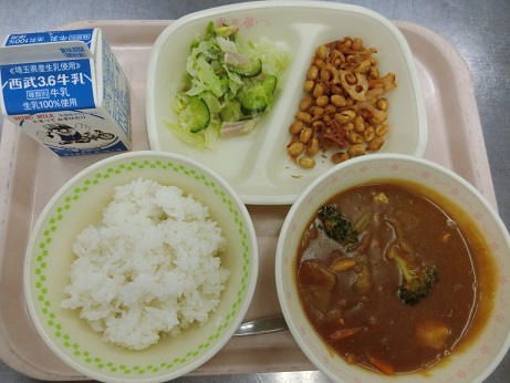 冬野菜カレーライス・大豆と蓮根のカリカリ揚げ・ハムのマリネ・牛乳