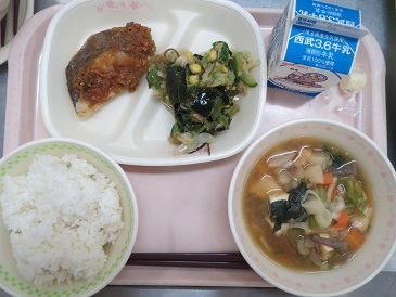きょうの献立は ごはん・白身魚の南蛮漬け・海藻サラダ・野菜椀・ チーズ・牛乳です。 エネルギー 823kcal たんぱく質 33.5g 脂 質 26.5g 食塩相当量 3.3g 11月下旬の気温?ともいわれる雨降る 寒い日になりました。 寒くなると、残りが多くなるのが牛乳 ですが・・・ 成長期の中学生に必要な栄養がたっぷり入っています。 残さず飲んでほしいですね