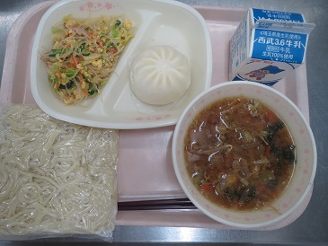 きょうの献立は ごまみそラーメン・彩の国肉まん・中華サラダ・牛乳です。 エネルギー 857 kcal たんぱく質 31.5g 脂 質 25.9g 食塩相当量 5.0g
