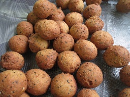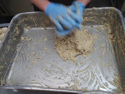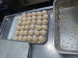 ホットケーキミックスにおから・卵・黒砂糖・黒ごまを合わせ牛乳で溶き、人数分に丸めます。
