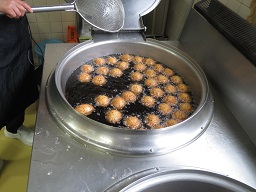 揚がると真ん中が膨らみ、真ん丸のドーナツのできあがり