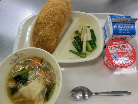 、きなこ揚げパン・牛乳・ワンタンスープ・スティック