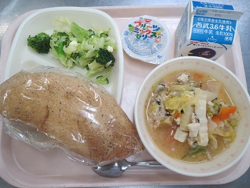 黒ごまきなこ揚げパン・キムチなべスープ・グリーンサラダ・