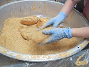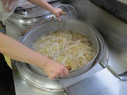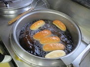 新しい油にコッペパンを入れ 浮かばないように、網で押さえます 黒ごまきな粉をまぶしてできあがり