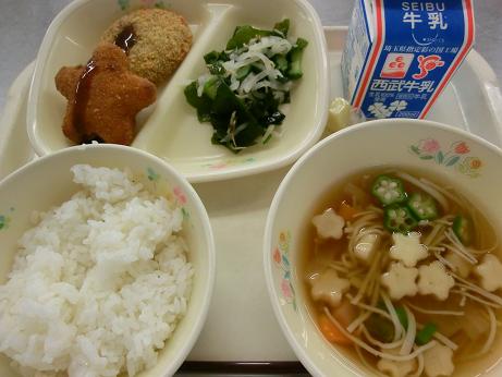 きょうは、 ごはん・牛乳・ミックスフライ・七夕スープ・温野菜 ・チーズでした。 七夕の行事食で、七夕スープに☆や天の川をイメージして 作りました。にんじんやだいこんを短冊に切り、そうめんや、 白い星型の麩を浮かべています。