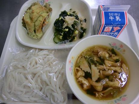きょうは、 山菜うどん・牛乳・抹茶パンケーキ・和風サラダ でした。抹茶パンケーキは、抹茶の他に甘納豆とチーズを 加えて作りました。 今月は、八十八夜にちなんでお茶を使った給食を献立に 取り入れています。