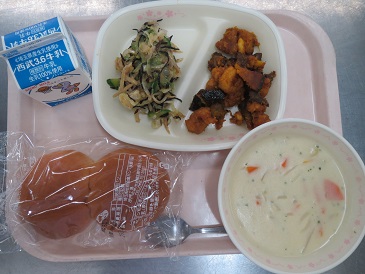 きょうの献立は はちみつパン・鶏肉とかぼちゃのオレンジ煮・ヘルシーサラダ・ 花豆のポタージュ・牛乳です。 エネルギー 827kcal たんぱく質 35.7g 脂 質 25.4g 食塩相当量 4.1g 鶏肉とかぼちゃのオレンジ煮は鶏胸肉・豚レバー・かぼちゃをそれぞれ揚げ オレンジジュース・砂糖・しょうゆ・みりんで作ったソースをからめます。 花豆のポタージュ、オレンジ煮ともに 生徒の大好きなメニューです |