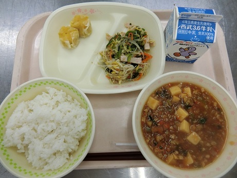 ごはん・四川風麻婆豆腐・にんじんしゅうまい・もやしのナムル・牛乳
