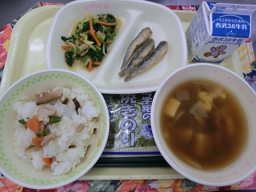 きょうの給食☆ 五目寿司の恵方巻 小いわしフライ 冬野菜のごまあえ けんちん汁 牛乳