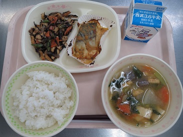 きょうの献立は ごはん・さばのみそマヨ焼き・大豆の磯煮・野菜椀・牛乳です。