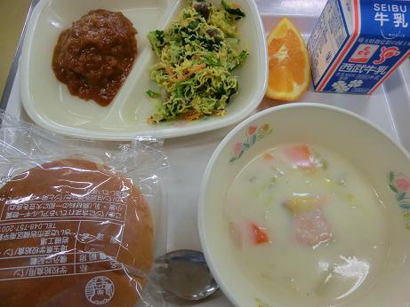 きょううは、 ハンバーガー・牛乳・鮭と春きゃべつのミルクスープ ほうれん草としめじのサラダ・いよかんでした。 鮭の入ったスープにはきゃべつがたっぷりと入りました。 ほうれん草のサラダには、下味をつけたしめじと錦糸卵を 加えています。
