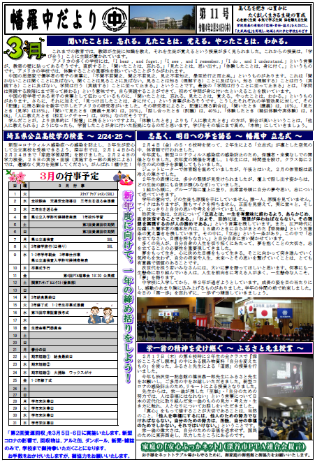 学校だよりをUPしました! 【 今月号の主な内容 】 聞いたことは,忘れる。見たことは,覚える。やったことは,わかる。 埼玉県公立高校学力検査 ~ 2/24・25 ~ 志高く,明日への夢を語る ~ 幡羅中 立志式 ~ 栄一翁の精神を受け継ぐ ~ ふるさと先生授業 ~ 3月の行事予定 家庭の「安心ふっかネット」(深谷市PTA連合会提言) 学校だよりは,上記の「お知らせ」の中にあります「学校だより3月・第11号」を クリックすることで,拡大してご覧いただくことができます。 左上「メニュー」の中にあります「学校だより」からも,拡大版をご覧いただけます |