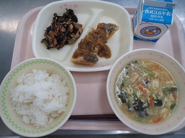きょうの献立は ごはん・白身魚の南蛮漬け・大豆の磯煮・サンラータン・牛乳です。 エネルギー 814 kcal たんぱく質 34.6 g 脂 質 23.8 g 食塩相当量 3.2 g