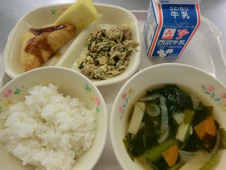 きょうは 、ごはん・牛乳・ゴーヤチャンプルー・チーズハンペン フライ・ワカメスープ・パイナップルでした。 ゴーヤチャンプルーは、毎年この時期に出す定番メニュー になりました。苦手な人がいるので残ってしまいますが、 初めて出した時に比べると食べるようになりました。 ゴーヤには、ビタミンCやカロテンが含まれているので 夏バテ予防には最適です。