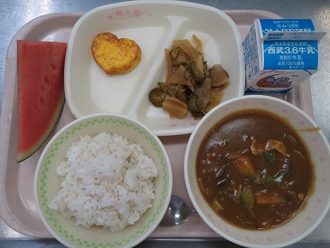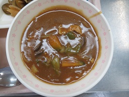 きょうのカレーライスには、夏野菜(なす、かぼちゃ、ピーマン)が入っています。