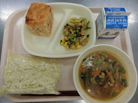 きょうの献立は ごまみそラーメン・いちごのパンケーキ・海藻サラダ・牛乳です。