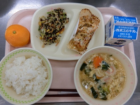 ごはん・チキンのねぎマヨポン焼き・ツナとひじきのサラダ・かき玉汁・みかん・牛乳