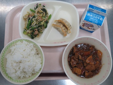 ごはん・家常豆腐・焼きぎょうざ・もやしのナムル・牛乳