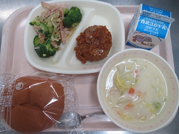 きょうの献立は ハンバーガー・ブロッコリーサラダ・白菜のシチュー・牛乳です。 エネルギー 823 kcal たんぱく質 34.7g 脂 質 27.3g 食塩相当量 4.6g