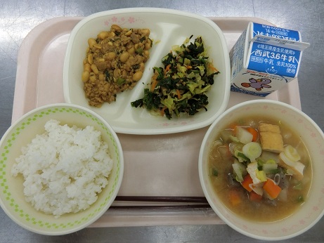 きょうの献立は ソイ丼・磯の香あえ・野菜椀・牛乳です。