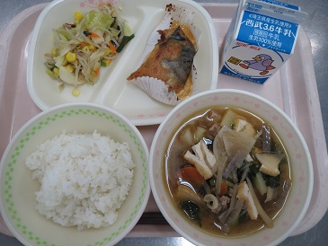 ごはん・さばのみそマヨ焼き・野菜炒め・豚汁・牛乳