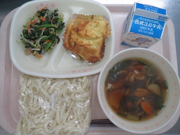 きょうの献立は 肉うどん・アップルパンケーキ・深谷産!ほうれん草とねぎのナムル・