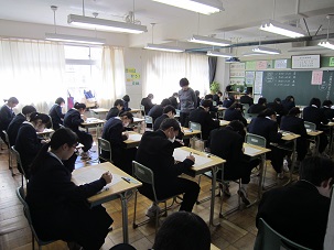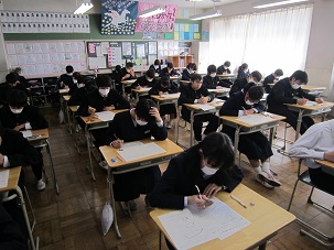 1,2年生で、2月27日(月)から、期末テストが始まりました。今日は技能教科中心です。あと2日間に渡りますので、しっかりと勉強しましょう。授業で学習したところが中心に出されますので、ノートをよ~く見ておく。そして、教科書の大事なところを確認しておくとよいでしょう。学習方法としては、別のノートに書き写すなど、五感を使って学習してください。 やればできるではなく、やったからできるへ!