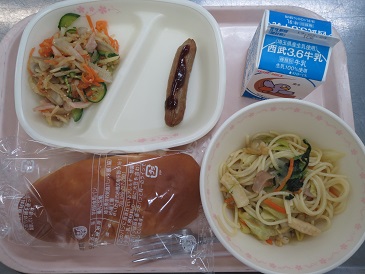 きょうの献立は パインパン・キャベツとあさりのスパゲティ・ごぼうのかみかみサラダ・ 牛乳です。 エネルギー 861 kcal たんぱく質 31.7 g 脂 質 27.5 g 食塩相当量 4.1 g