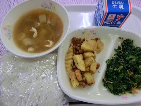 きょうは、 ねぎまうどん・牛乳・大豆とポテトの揚げ煮・ほう れん草のごまあえでした。 きょうのほうれん草は深谷市から提供していただきました。 ぎっしり詰まった箱にたくさんいただいたので、おいしい「ごま あえ」がたっぷりとでき上がりました。 寒くなってくると牛乳の残りが増えます。麺類の日は特に 多く残るようです。 |