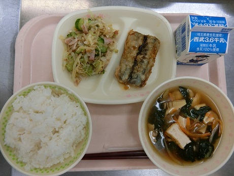 きょうの献立は ごはん・さんまのかば焼き・たくあんサラダ・沢煮椀・牛乳です。