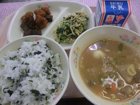 わかめごはん・牛乳・豚肉の香味揚げ・重忠汁