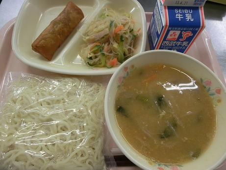 きょうは、 ごまみそラーメン・牛乳・ひじき入り春巻・春雨 サラダでした。 ごまみそラーメンは生徒に人気のメニューです。どのクラスも 残りがなくとてもよく食べていました。 |